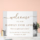 Chic blanc acrylique signe de bienvenue pour vous mariage avec "Bienvenue à notre heureux après" dans un mélange de typographie moderne simple et un script élégant avec des swashes, "Nous sommes si heureux que vous êtes ici," et vos noms et date mariage.