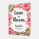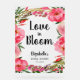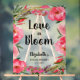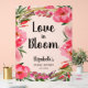 Un grand panneau de bienvenue de douche nuptiale en acrylique gelée présente "L'amour en fleur", le nom de la mariée, et la date en lettres chic entourée d'élégantes fleurs roses. MODIFIEZ LA TAILLE pour correspondre à votre événement. Objets MATCHING et plus de signes dans notre collection.
