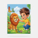 Cute and colorful alphabet poster featuring the letter L with a cheerful child and a friendly Lion illustration.