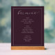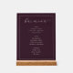 This elegant bar menu design exudes a sophisticated and timeless charm, perfect for wedding receptions or formal events. The deep burgundy background paired with the delicate white script typography creates an air of refinement and class. Featuring categories like beer, wine, and spirits, it offers a clear and organized selection for guests to enjoy. The simple yet stylish layout ensures that your event's beverage options are presented in an inviting and memorable way, enhancing the overall ambiance of your special occasion.