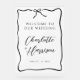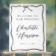 Un simple panneau de bienvenue de mariage à la typographie moderne minimaliste manuscrite noire et blanche comportant un cadre de ruban ondulé avec un petit nœud dans un style dessiné à la main. Style coquette fantaisiste informel. Fantaisie moderne simple. Pour un style de mariage plus informel et ludique.