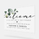 Moderne simple et élégant avec calligraphie "bienvenue" et eucalyptus vert feuillage signe acrylique mariage.