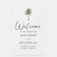 Panneau de bienvenue mariage tropical avec un simple palmier en haut du design avec "Welcome" affiché dans un script de calligraphie blanc moderne avec un arrière - plan acrylique faux givré. Personnalisez le signe mariage de palmier avec vos noms, la date du mariage et l'emplacement du mariage. Le panneau de mariage tropical acrylique a été conçu pour coordonner avec notre collection de mariages minimaux de palmiers.