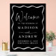 Bienvenue invités à votre mariage dans le style avec ce moderne Black and White Wavy Frame mariage acrylique signe d'accueil! Le design présente vos noms et détails mariages en lettres blanches contrastant avec un arrière - plan noir. Une bordure blanche ondulée entoure vos détails mariages donnant à cet accueil mariage un signe rétro, mais moderne.