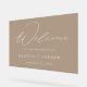 Elégant signe d'accueil de mariage avec "Welcome" dans un script moderne de calligraphie blanche avec un arrière - plan acrylique taupe. Personnalisez le panneau mariage acrylique en ajoutant vos noms et votre date de mariage. Le panneau d'accueil taupe est conçu pour coordonner avec notre collection de mariage Modern Elegance et est disponible en d'autres couleurs/options de style.