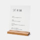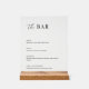 Le panneau acrylique de mariage moderne et élégant pour le menu "the bar" présente un design minimaliste noir et blanc. Personnalisez avec votre menu boisson mariage avec le modèle facile à éditer avec une police de script élégante et une police serif classe. Le panneau acrylique peut être commandé avec ou sans support en bois. Découvrez les objets correspondants dans la collection "Modern Elegant".