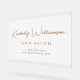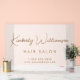 Signe acrylique poli chic pour votre entreprise avec une ambiance minimaliste avec votre nom d'entreprise ou marque dans un script de signature or élégant et texte supplémentaire ci-dessous si désiré dans la typographie or moderne.