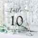 Élégant mariage transparent numéro de table signe acrylique avec "table" dans un script de calligraphie élégant avec des swashes, le numéro de table dans élégante typographie serif, vos prénoms joints par un coeur et votre date de réception. Créez chaque signe de numéro de table et ajoutez-le au panier un à la fois, puis retirez-le une fois que tous les numéros sont dans votre panier.
