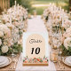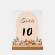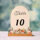 For an elegant and romantic wedding. A clear, transparent background decorated with orange, peach and pink florals. Arch shaped frame. Personalize and add your table numbers one by one.