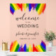 Signe d'accueil en acrylique Rainbow LGBTQ avec des traits de couleur de drapeau de la fierté imprimés sur l'arrière - plan acrylique transparent et encadrant le texte noir. Bienvenue à vos invités mariages avec ce panneau mariage LGBTQ imprimé sur acrylique avec une version artistique du drapeau de la fierté sous forme de traits de pinceau dans les couleurs du drapeau arc-en-ciel.