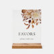 Automne Favore Le Signe Acrylique. Cette élégante enseigne "favors" mariage est ornée d'une aquarelle peinte à la main, de feuilles orange brûlé et en terre cuite, de dahlias crème et beige, et de beaux roses couleur rouille sur un arrière - plan clair. Trouvez les articles correspondants dans la collection Black Autumn Romance.