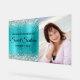 Créez votre propre 16ème anniversaire de fête bienvenue acrylique signe pour votre fille. Remplacez l'exemple d'image par votre propre photo de famille. Customisez l'élégante calligraphie moderne avec une police moderne de style casquette pour créer votre propre enseigne personnalisée. L'arrière - plan présente une fausse parties scintillant argent brillant sur un art numérique en métal brossé bleu turquoise sombre en métal brossé graphique. La parties scintillant, brillante et métallique est créée avec des graphiques numériques qui s'impriment comme une photo sur votre panneau.