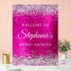 Créez votre propre 16ème anniversaire bienvenue 18x24 panneau acrylique vertical pour votre fille. Remplacez l'exemple d'image par votre propre photo de famille. Customisez l'élégante calligraphie moderne avec une police moderne de style casquette pour créer votre propre enseigne personnalisée. L'arrière - plan présente une parties scintillant en argent scintillant avec un graphisme d'art numérique magenta rose chaud brossé métal sombre foil grisé. La parties scintillant, brillante et métallique est créée avec des graphiques numériques qui s'impriment comme une photo sur votre panneau.