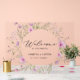 Bienvenue dans un mariage, avec une élégante bordure fleurie aux tons rose vif, fleur sauvage et violet, et feuillage vert. Le texte central accueille chaleureusement les invités avec "Bienvenue à notre mariage, en indiquant le nom du couple et la date de leur journée spéciale. Cette enseigne personnalisée est généralement placée sur un chevalet à l'entrée du lieu mariage, donnant un ton magnifique et accueillant à la célébration.