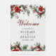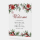 Elegant wedding welcome sign featuring beautiful red poinsettia flowers with pine cones and leaves.