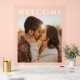 This wedding sign features a warm, romantic design with a central photograph of two individuals in an intimate pose, set against a backdrop of soft beige and brown tones. The layout is vertically oriented, with bold white text at the top spelling "WELCOME" and elegant cursive script below for customizable names, creating a personalized touch. The typography combines modern sans-serif and flowing script fonts, enhancing readability and adding sophistication. The overall mood is one of warmth and celebration, perfect for welcoming guests to a special occasion.