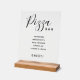 Ajoutez ces panneaux acryliques transparents minimalistes et modernes à votre réception de mariage. Personnalisez le texte avec les types de pizza disponibles ou ajoutez le texte personnalisé dont vous avez besoin. Conception de calligraphie simple en lettres noires avec un style de police de script intemporel.