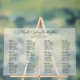 Panneau de siège opaque, acrylique, mariage pour chevalet. Texte noir, avec les noms du couple sur le dessus et douze numéros de table avec les noms listés. Supprimez les tables de manière stratégique si nécessaire. Taille 20x30 pouces montré, avec huit lignes pour les noms sous chaque "Table".