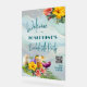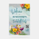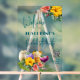 Symbole de la fête de la mariée. Thème tropical, panneau acrylique opaque avec texte personnalisé, arrière - plan de vagues bleues et fleurs hawaïennes. Les cocktails délicieux font partie du design floral au fond. L'hibiscus jaune, l'anthurium rose et les feuilles verts complètent le design. Ajoutez un code QR pour les invités à utiliser pour envoyer de l'argent sur le compte de la mariée. Une fois le code ajouté, assurez-vous qu'il fonctionne. Cela peut également être supprimé dans l'outil de conception, ou me demander de l'aide. Le design est conçu pour s'adapter à la taille 12 x 18 mais il sera transféré vers d'autres tailles, sauf pour les deux plus grandes.