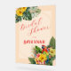 Bridal shower big, acrylic sign with tropical theme. Hibiscus flowers and jungle leaves images at top and bottom of large sign for an easel. Sample text is "Bridal shower for (name)" in pink-red color. A colorful parrot sits among the floral at the bottom corner. Pale, coral orange color for the background with a lighter "panel" behind text. Wording is outlined with a thin, line frame. Size shown is 18 x 24 inches, but the design transfers to larger and some smaller sizes.