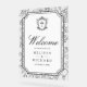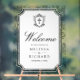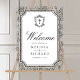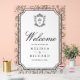 Elegant catholic wedding welcome sign featuring beautiful victorian crest with intricate details.