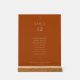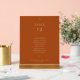 Elevate your reception décor with this terracotta wedding table number sign, featuring a warm earthy tone and refined minimalist typography. The clean layout beautifully displays table numbers and guest names, while subtle botanical accents add a soft, modern touch. Perfect for boho, rustic, or autumn weddings, this design brings warmth and sophistication to every table.