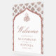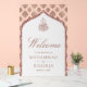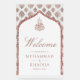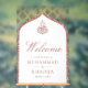 Amaze your guests with this islamic wedding welcome sign featuring an elegant arch and 'Bismillah' in Arabic calligraphy on a damask pattern background.