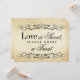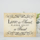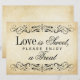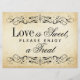 Des volutes décoratives et des fioritures encadrent ce panneau de table de dessert élégant et vintage inspiré "L'amour est doux, profitez d'une friandise". Fond avec une apparence texturée de style ivoire antique.