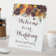Un tournesol et une pivoine bordeaux Bienvenue à Notre panneau de table Mariage avec un éclat d'or brillant avec vos noms et date le long du fond.