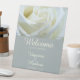 Elégant et moderne, panneau de piédestal mariage rose blanche. Le texte peut être personnalisé pour votre jour de mariage ou tout type de célébration.
