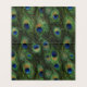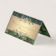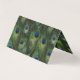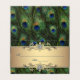 Cartes de table de mariage paon pliées avec un beau bijou doré au centre sur un fond de plume de paon magnifique.