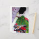 D'une aquarelle originale peinte par l'artiste Sacha Grossel d'une Geisha japonaise avec un kimono vert décoré, tendance et obi noir et rouge tenant un parapluie violet décoré de fleurs. Ce design d'inspiration japonaise et Kyoto est influencé par l'art oriental et asiatique et par le design de mode traditionnel japonais.