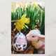Boulet de Pâques baisant Oeuf de vache Photo par Sable Closs Lapin de Pâques / Lapin et Vache Noire et blanche OEuf de Pâques avec jonquille jaune.