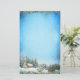 Cette papeterie de Noël aquarelle présente un paysage hivernal paisible et enneigé, avec un cabine niché dans les bois, et le ciel couvert de flocons de neige feuilles beaucoup de place pour l'écriture. Le dessus et le fond sont parés de verdure festive.
