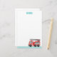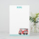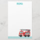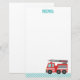 Une papeterie avec un camion de pompiers rouge mignon qui a les rayures blanches sur son côté et une échelle escamotable avec le tuyau. Frontière inclinée de rayures bleues en bas. Palette de couleur de rouge, de bleu, gris et blanc. Le texte lit la "note". Grand pour le peu ceux, particulièrement garçons, qui aiment des jouets et des pompes à incendie de véhicule !