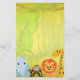 Une scène de jungle d'amusement avec des arbres, des vignes, et une rivière comme arrière - plan et un éléphant, un singe, un lion et une girafe regardant dessus. Décrit dans des parties scintillantes comme le cadre. Grand pour un baby shower de garçon ou de fille.