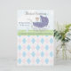 Un petit bébé gardé mignon avec un bébé dans un chariot vintage bleu sur une pelouse gazonnée, garni d'oiseaux bleus et d'un lapin bleu lapin, contre un ciel bleu pastel avec des nuages blancs bouffants. Le nom de l’enfant est placé en haut de l’étiquette décorative, tandis que la date de naissance et l’heure de naissance, la longueur et le poids de l’enfant sont indiqués en bas et en bas de l’étiquette bleue. Un souvenir parfait pour le nouveau bébé garçon. Tout cela sur un arrière - plan Jacquard bleu, blanc et rose (diamant). Une excellente idée cadeau pour les nouveaux parents.