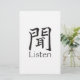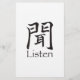 Le symbole Kanji japonais pour le mot "Ecouter" est montré dans les coups de pinceau de calligraphie et a l'air très cool sur un tee-shirt, sac, casquette, ou bouton. Nous avons même ajouté la traduction anglaise ci-dessous pour que les gens reçoivent le message. La conception du personnage est basée sur une passerelle avec une oreille à l'intérieur. Joli cool ! Vous pouvez modifier la couleur de l'arrière - plan et ajouter du texte.