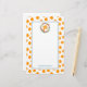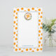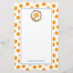 Papeterie personnalisée avec l'illustration d'un joli visage de girafe souriant, entouré d'une couronne de fleurs tropicales d'aquarelle. Coloré et mignon. Arrière - plan est un motif avec des taches oranges. Un cadre rectangulaire blanc avec une bordure bleue au centre pour une écriture lisible et facile. Personnalisez avec votre nom le long du bas.