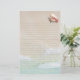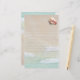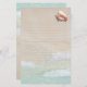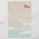 Papier à écritures recouvert de sable de plage arrière - plan et coquille de conque rose. Jolie papeterie sur le thème de la plage pour écrire des notes personnelles à quiconque. Les deux côtés sont décorés de sable et d'image de surf contenant de l'eau tropicale bleu turquoise. Les vagues montent du bas à l'avant et descendent du haut à l'arrière. Une image de coquille de conque queen se trouve en haut et les lignes sont gris clair.