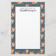 Papier de papeterie personnalisé avec un motif fait avec des renards orange mignons et heureux. Arrière - plan vert foncé. Petits champignons et feuilles parsemés. Un rectangle blanc superposé pour écrire à l'intérieur.