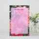 Papeterie éditable avec lettres de script violet et photographie florale élégante de roses rayés rose et blanc fleurit sur un rose floribunda héritier, avec un arrière - plan translucide teinté rose.