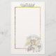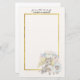Papier à lettres personnalisé avec un nom. Dessin d'un ange doux aux ailes jaunes tenant un berger crook. Assis avec des agneaux blancs. En regardant au-dessus de son troupeau. L'aquarelle douce s'écoule autour de l'image. Placez-vous sur un arrière - plan blanc en coquille d'oeuf. Une fausse bordure en feuille d'or autour des bords. L'apparence de la feuille de Goil n'est qu'une image, pas un film réel.