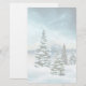 Papier à lettres avec une image défraîchie. Une belle aquarelle. Des pins couverts de neige sur une scène hivernale. Les flocons de neige tombent sur un sol enneigé. Des nuages blancs et bleus moelleux dans le ciel. Avec un lac gelé dans l'arrière - plan. Vibe de silence.