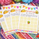 Taco bout a Baby Shower Bingo Game - so fun for the guests and mom-to-be. Light yellow squares with a cute taco and avacodo with "talik about a baby" for a fiesta theme baby shower.