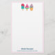 Papier papeterie avec illustration de 3 friandises différentes à la crème glacée. Un coquelicot bleu-vert avec des gouttes de fraises et des arrosages colorés. Un popsicle de pastèque. Un cône avec des couches de délicieuses glaces en rose et menthe. Tous avec mignon kawaii sourit.