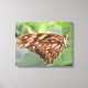 Cette impressionnante impression de toile présente une photo d'un beau papillon tropical. Il possède de jolies ailes marron recouvertes de taches d'orange, de blanc et de bronze. La photo a été prise en utilisant la macro photographie pour un résultat étonnamment détaillé.