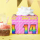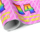 Cette conception amusante et festive de papier d'emballage sur le thème du 14e anniversaire comprend un grand nombre de "14" ayant un motif coloré inspiré par l'apparence d'un spectre arc-en-ciel. Il comporte également le message "Joyeux 14ème anniversaire", suivi d'un nom modifiable. L'arrière - plan est décoré d'un joyeux motif aux rayures rose clair et rose foncé, aux coeurs roses aimés. Un papier d'emballage à thème d'anniversaire comme celui-ci pourrait être une façon amusante d'envelopper un cadeau ou un cadeau donné à quelqu'un qui célèbre son 14e anniversaire. [~Z0000415]