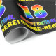 Ce papier d'emballage coloré, joyeux et amusant à thème d'anniversaire comporte un grand nombre de "18" et le message "HAPPY BANTHDAY", tous deux ayant un dégradé arc-en-ciel coloré inspiré couleur motif, ainsi qu'un nom de destinataire personnalisé jaune gras. L'arrière - plan est noir de couleur. Un papier d'emballage amusant comme celui-ci pourrait être utilisé pour envelopper les cadeaux donnés à quelqu'un pour célébrer leur 18e anniversaire. [~Z0000475]