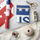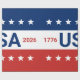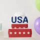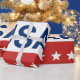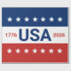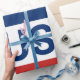 Célébration du 250e anniversaire des États-Unis. Ce papier d'emballage rouge, blanc et bleu porte le mot 'États-Unis' au centre. Les années 1776 et 2026 sont à côté. La bande supérieure est bleue avec des étoiles blanches. La bande du centre est blanche. La bande inférieure est rouge avec des étoiles blanches.